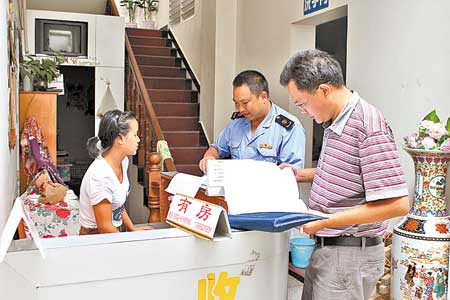 检查组到宾馆、酒店现场查看安全套摆放登记台账(赵俊华 摄影)