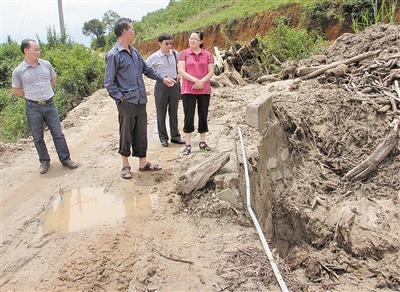 一到富联村,刀红艳一行就和当地村干一同前往受损严重的下拱别和弄考启两个村民小组,实地查看和详细了解因洪涝灾害损毁的农作物、供水水管及道路、桥涵受损情况。刀红艳一边查看灾情,一边深入了解全村情况,对该村干部和驻村指导员及时发动群众进行道路抢修,桥涵、沟帮清理,架通供水水管等自救工作给予了充分肯定,当即表示帮助解决山体滑坡损毁道路修复资金,并就进一步开展好防灾减灾、生产自救工作对相关人员提出要求:要深入各村民小组进一步核实灾情,确保不漏登、不错登,实事求是地向上级有关部门作好灾情报告;要做好受灾群众的安抚工作,做到灾而不乱,损而不慌,确保全村安全稳定;要及时做好灾后安全隐患点的排查,严防次生伤害发生,努力保障群众的人身安全;要及时组织开展生产自救工作,迅速恢复生产生活秩序,最大限度地减少洪涝灾害造成的损失;要密切关注灾情动态,做好汛期维稳工作,落实24小时值班制度,确保抗洪救灾大局稳定。