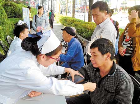工作人员为市民量血压