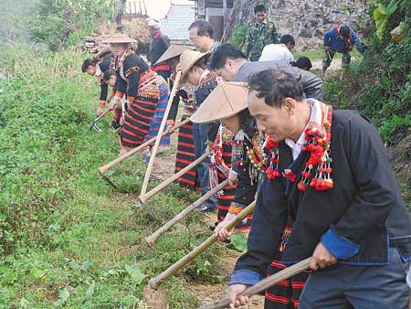 穿着节日的盛装,手里却拿着锄头、长刀等劳作工具。
