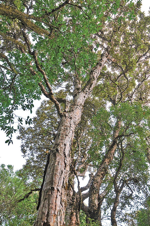 在三锅疆村委会党支部书记何中芳的引领下,我们向大山上挺进。在车上,50多岁的何中芳就打开了话匣子:“我们的杜鹃树都是野生的,有几百年的历史了,我小的时候就喜欢在山上玩,看到的杜鹃树就有这么大,现在也是老样子。”来到一棵体型较大的杜鹃树下,何支书张开手臂环抱着这株杜鹃,却抱不过来。何中芳说:“这可不是直径最大的杜鹃树,属于中等的。最大的树围50公分,在林子深处呢。这里是国有林,没有人来砍树,所以草深林密,很难走进去。”