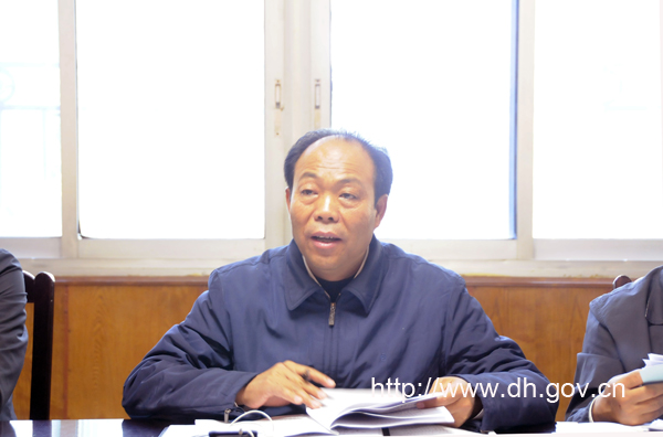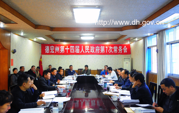 20131126上午,州长龚敬政主持召开第十四届州人民政府第七次常务会议。会议就加快生态畜牲业发展实施方案、开展农民增收工程活动方案、进一步加强农村扶贫开发的实施意见、加快山区经济社会发展工作实施意见、进一步加快较少民族发展的实施意见、实施建设创新型德宏行动计划等问题进行了讨论研究。