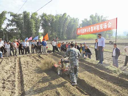 在培训会现场,技术专家分别向农民讲解了种薯催芽、种茎消毒、合理密植、科学施肥、病虫草害综合防治等技术措施,现场演示了开沟培土机的合理操作方法。参会农民对农机具表现出极高的兴趣,纷纷要求亲手操作演练。掌握了操作要领的一个农民认为,开沟培土机操作简单,开沟、起垄效果好、速度快,能节省大量劳动力。