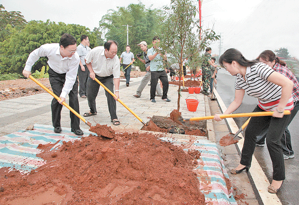 在环城东路与仙池路交叉口处的植树活动现场,到处都是忙碌的身影。800多名参与义务植树的干部职工个个干劲十足,场面热火朝天。植树现场,人们积极投入到植树劳动中,有的挥锹培土,有的扶树围土,有的提水浇灌,盖土、浇水等各个环节都精心对待,栽得认真,干得卖力。“这是我第二次来参加植树活动了”,来自武警德宏支队的刘华俊很自豪地告诉记者,“作为一名军人,我希望能从点滴做起,为保护好我们身边的青山绿水做出一份自己的努力。”