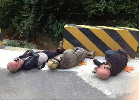 连续参与救援20多个小时里,救援队伍分批进入矿井救援,换班的时候,疲惫不堪的他们就在公路边或坐或卧休整,实在疲惫得不行就在地面上眯一会。真心为这些参与救援的人员点赞。(本报记者 肖素梅 图片摄影:记者 焦迪 寸超 德宏团结报微友 等)