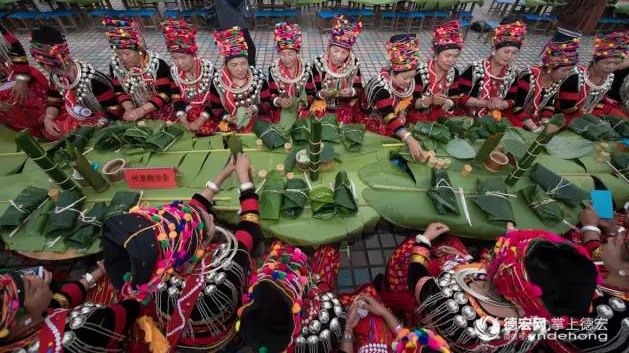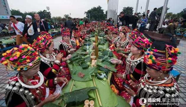 “世界人数最多的景颇族绿叶宴”——景颇族被誉为大山的民族,有着灿烂的饮食文化,绿叶宴就是其中之一,它是从景颇族古老传统的饮食习惯中诞生的,是景颇族最传统、最原生态的宴席。正如景颇族的民谣所言:“山里的东西,绿的是菜,动的是肉”。本次目瑙纵歌节民族团结晚宴,景颇人民就用这种独具特色的“绿叶宴”喜迎八方宾客。本场宴席就餐人数超3391人。