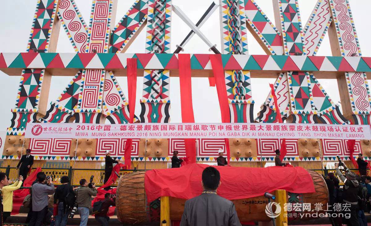 世界最大的景颇族蒙皮木鼓——木鼓是景颇族古老的一种打击乐器,它来源于景颇族传说中的祭祀活动“章目瑙”,是目瑙纵歌必备的伴奏乐器。据了解,本次目瑙纵歌节共制作4个大木鼓,其中最大的一个申报世界记录。该木鼓用截断的树干凿制而成,鼓身中空,两端蒙牛皮,木鼓全长6.15米,鼓面直径1.35米。