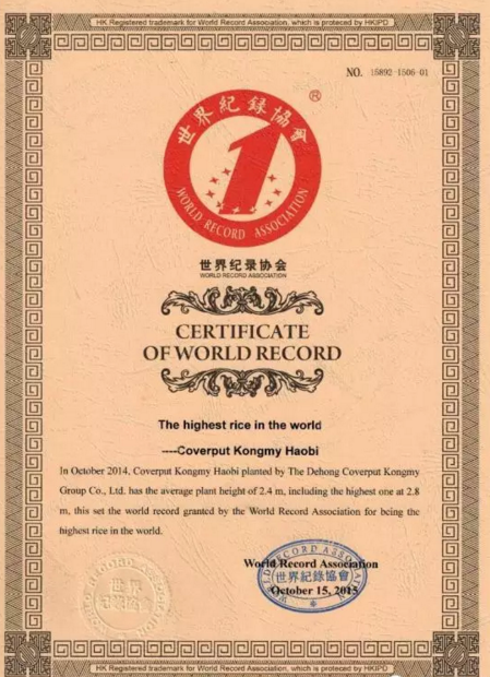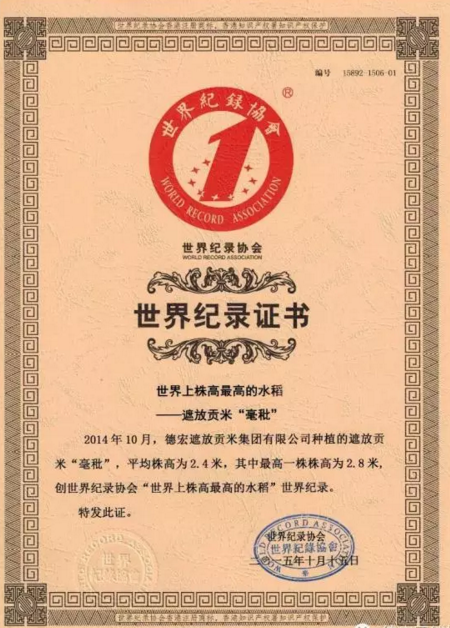 “ 世界上株高最高的水稻:遮放贡米毫秕”——遮放贡米是在德宏州芒市遮放镇特定的地理环境下孕育而出的自然结晶。1623年明天启年间,熹宗皇帝钦赐“遮放贡”。遮放贡米毫秕为古老名特稀优物种资源,在原产地遮放允午村恢复性种植成功后,每年作为物种保护定量种植100-200亩,其生长周期约180天,平均株高2.4米左右,最高株高可达2.8米。