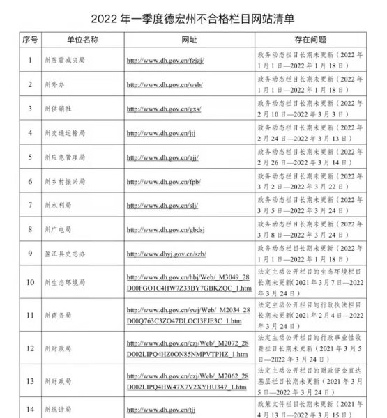 (一)网站运维管理仍然不到位。部分单位对栏目网站运维管理不规范,内容保障不及时,出现了长期不更新的情况。如:州生态环境局生态环境栏目、州商务局行政执法栏目、州统计局政策文件栏目、州财政局行政事业性收费栏目和财政资金直达基层栏目超300天未更新信息;梁河县九保阿昌族乡人民政府、盈江县农业农村局政策文件栏目超100天未更新信息。