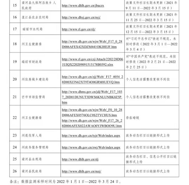 (二)内容审核把关不严格。部分单位未严格落实“三审”制度,对发布信息内容审核把关不严,严重表述错误问题依然突出。如:瑞丽市财政局出现政治类表述错误;部分单位对个人信息泄露问题不够重视,复核工作不够严谨。如:州住房城乡建设局、芒市市场监管局整改个人信息泄露问题不彻底;部分单位不按照省、州信息发布流程操作要求发布信息,敷衍了事直接跳转链接发布信息。如:州退役军人事务局、州政务服务管理局、梁河县水利局、梁河县民政局。