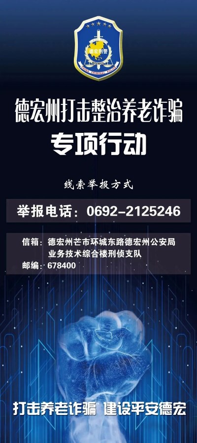 根据党中央决策部署,从4月中旬起到10月中旬,在全国开展为期半年打击整治养老诈骗专项行动。为依法严惩养老诈骗违法犯罪,着力整治规范以“养老”为名的涉诈问题隐患,坚决铲除养老诈骗违法犯罪滋生土壤,确保我州打击整治养老诈骗工作取得实效,现向社会公布举报方式。