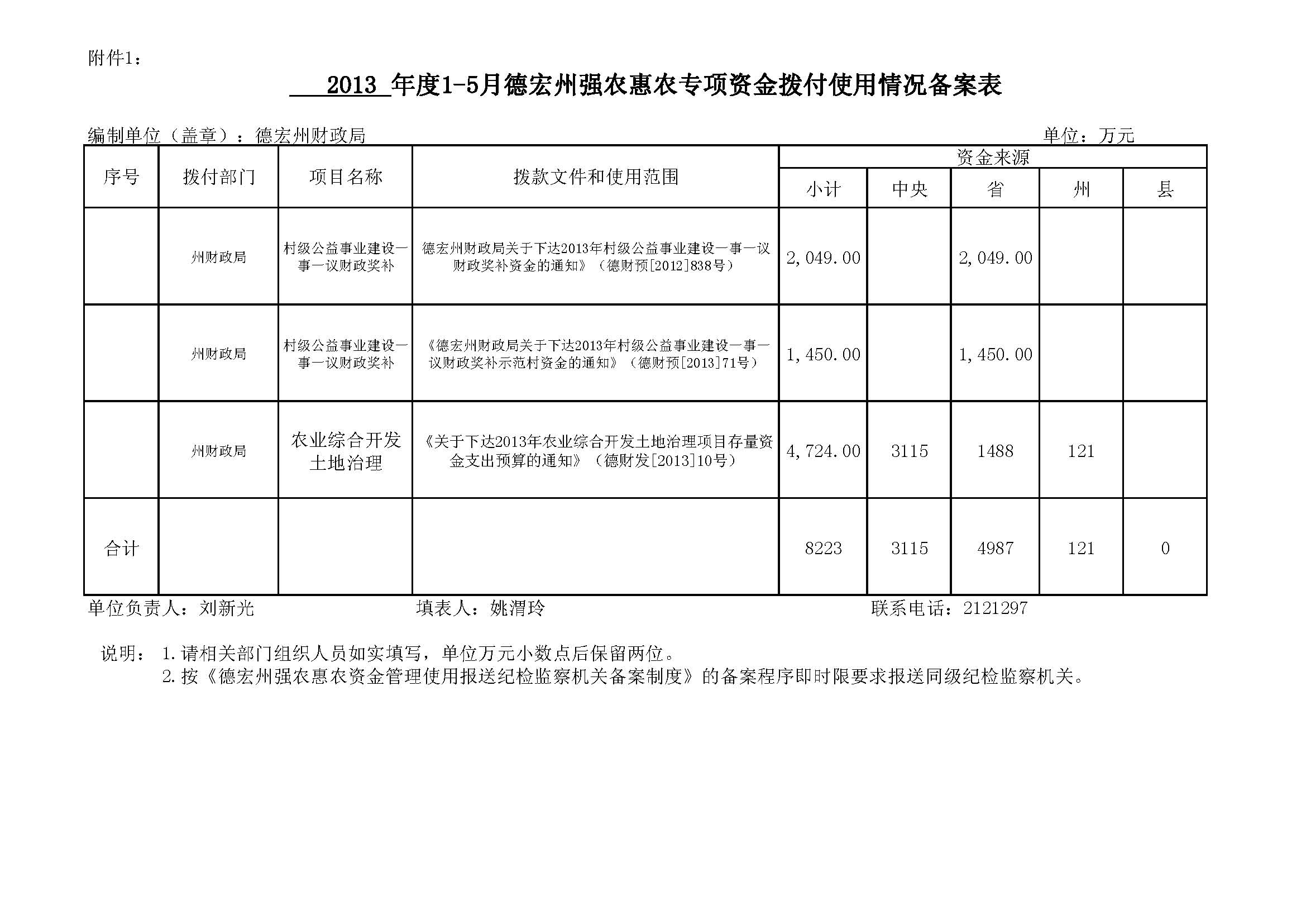 2013年度1-5月德宏州强农惠农专项资金拨付使用情况