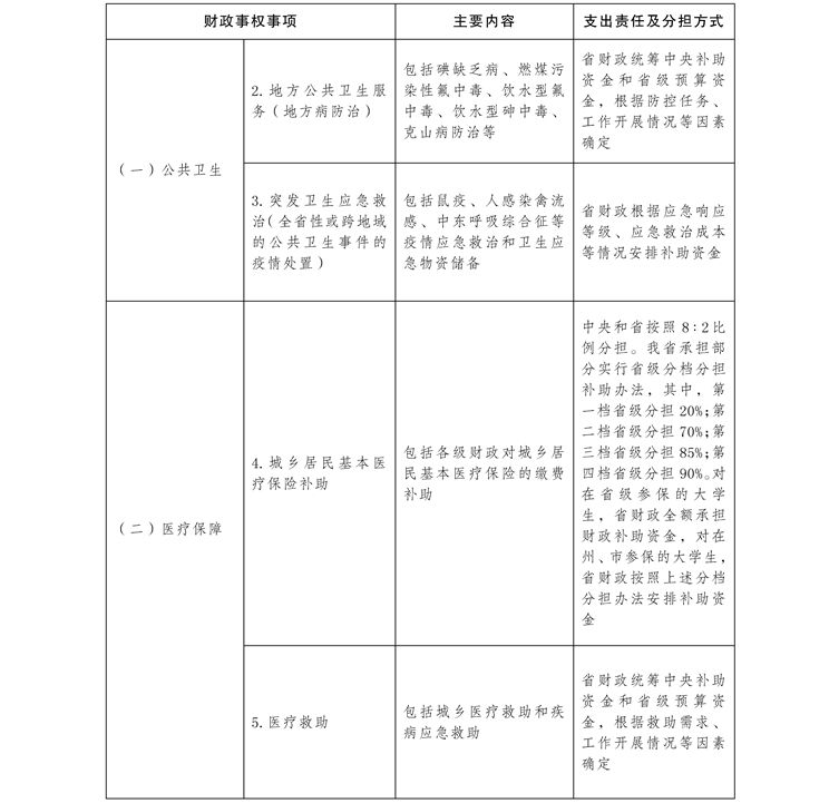 3. 地方公共卫生服务。地方病防治为中央、省与各地共同财政事权,由中央、省与各地财政共同承担支出责任。全省性或跨地域的传染病防控等地方公共卫生服务,主要包括国家免疫规划冷链能力建设,疟疾、麻风病、登革热防治等划分为省财政事权,由省财政承担支出责任。各地地域内传染病防治等公共卫生服务划分为各地财政事权,由各地财政承担支出责任。