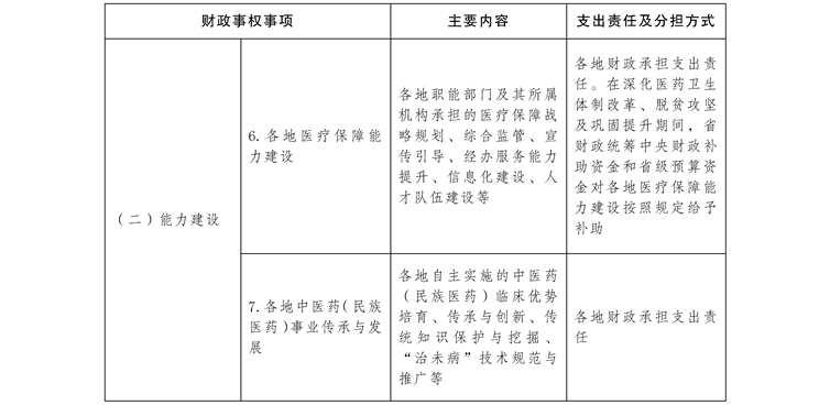 4. 医疗保障能力建设。主要包括医疗保障战略规划、综合监管、宣传引导、经办服务能力提升、信息化建设、人才队伍建设等,按照承担职责的有关职能部门及其所属机构隶属关系,分别明确为省财政事权或各地财政事权,由同级财政承担支出责任。