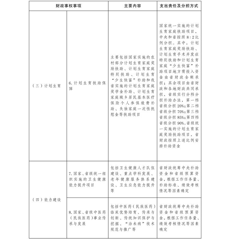 主要包括国家实施的农村部分计划生育家庭奖励扶助、计划生育家庭特别扶助、计划生育“少生快富”补助和我省实施的计划生育家庭奖学金补助、计划生育家庭城乡居民基本医疗保险个人参保缴费补助、失独家庭一次性抚慰金等扶助项目,为中央、省与各地共同财政事权,由中央、省与各地财政共同承担支出责任。其中,农村部分计划生育家庭奖励扶助、计划生育手术并发症特别扶助和计划生育“少生快富”补助,省财政暂按现行政策给予补助;其余项目参照基本公共卫生服务省级分档分担办法执行。上述项目外的原计划生育项目,纳入基本公共卫生服务统筹安排。