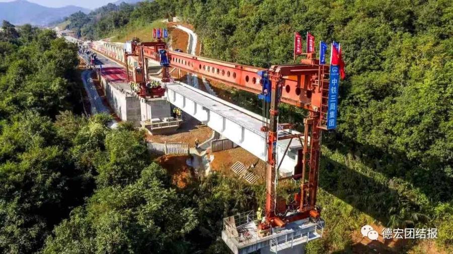 中铁三局大瑞经理部项目经理温建刚告诉记者,为保证工程施工进度,他们将制梁场优选在大瑞铁路芒市西站,紧邻施工现场,制梁场每日可预制T梁3片,目前已经预制成品T梁165片。开始桥梁架设后,平均每天可架设T梁2孔4片以上,确保架梁按施组计划稳步推进。