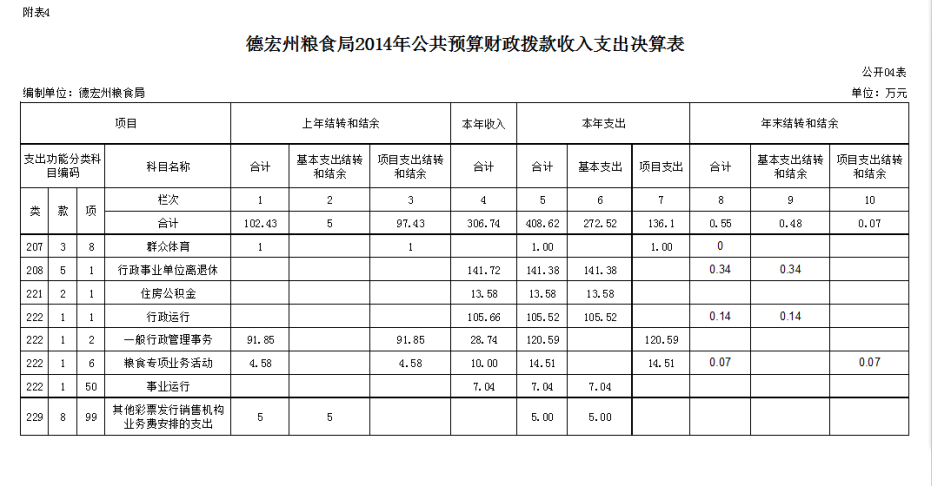 德宏州粮食局2014年公共预算财政拨款收入支出决算表
