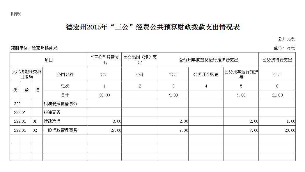 德宏州粮食局2015年“三公”经费公共预算财政拨款支出情况表