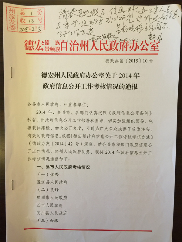 德宏州人民政府办公室关于2014年政府信息公开工作考核情况的通报(批示情况)