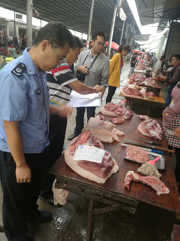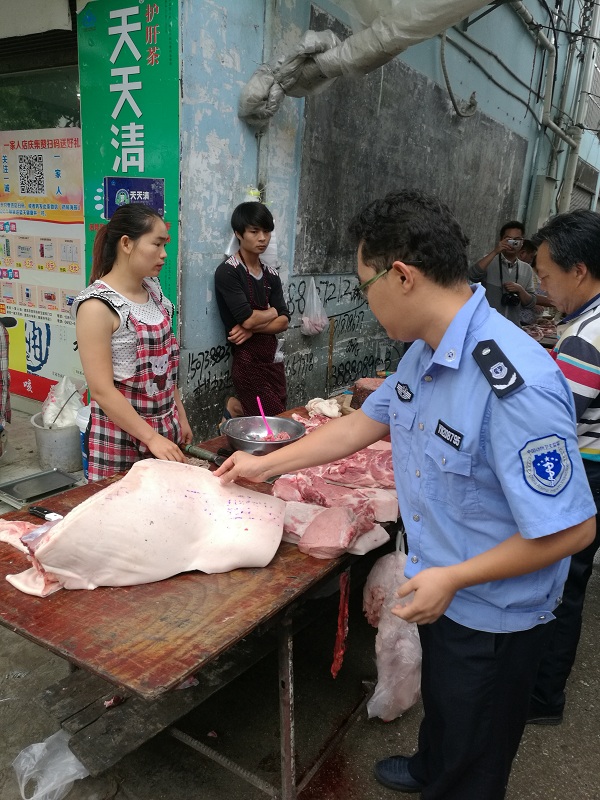 6月2日上午,动物卫生监督所配合安市局,遮岛镇对县城农贸市场、宏兴市场上市猪肉进行监督检查。经检查该日共上市猪肉47头,均来自定点屠宰场梁河县金利食品有限责任公司,经过检疫,未发现屠宰出售病死猪肉情况。