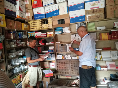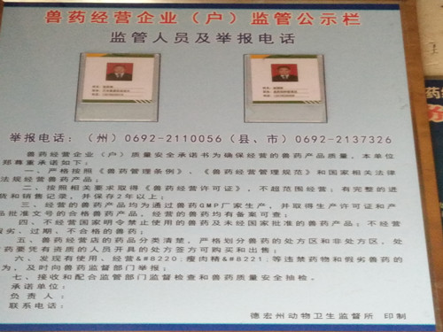 为规范兽药市场,加强对假劣兽药经营门店的打击,维护消费者的合法权益。根据《云南省农业厅转发农业部关于组织开展2017年第七批假兽药查处活动文件的通知》(云农牧〔2017〕49号)。2017年8月14日芒市动物卫生监督所在雷开贵所长带领下一行4人,对芒市城区范围内的兽药经营门店组织开展第七批假兽药执法检查活动。