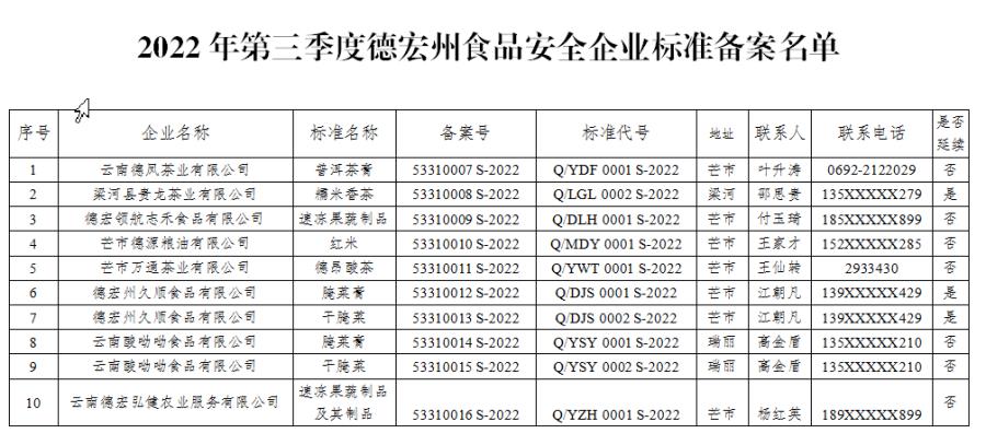 2022年第三季度德宏州食品安全企业标准备案名单