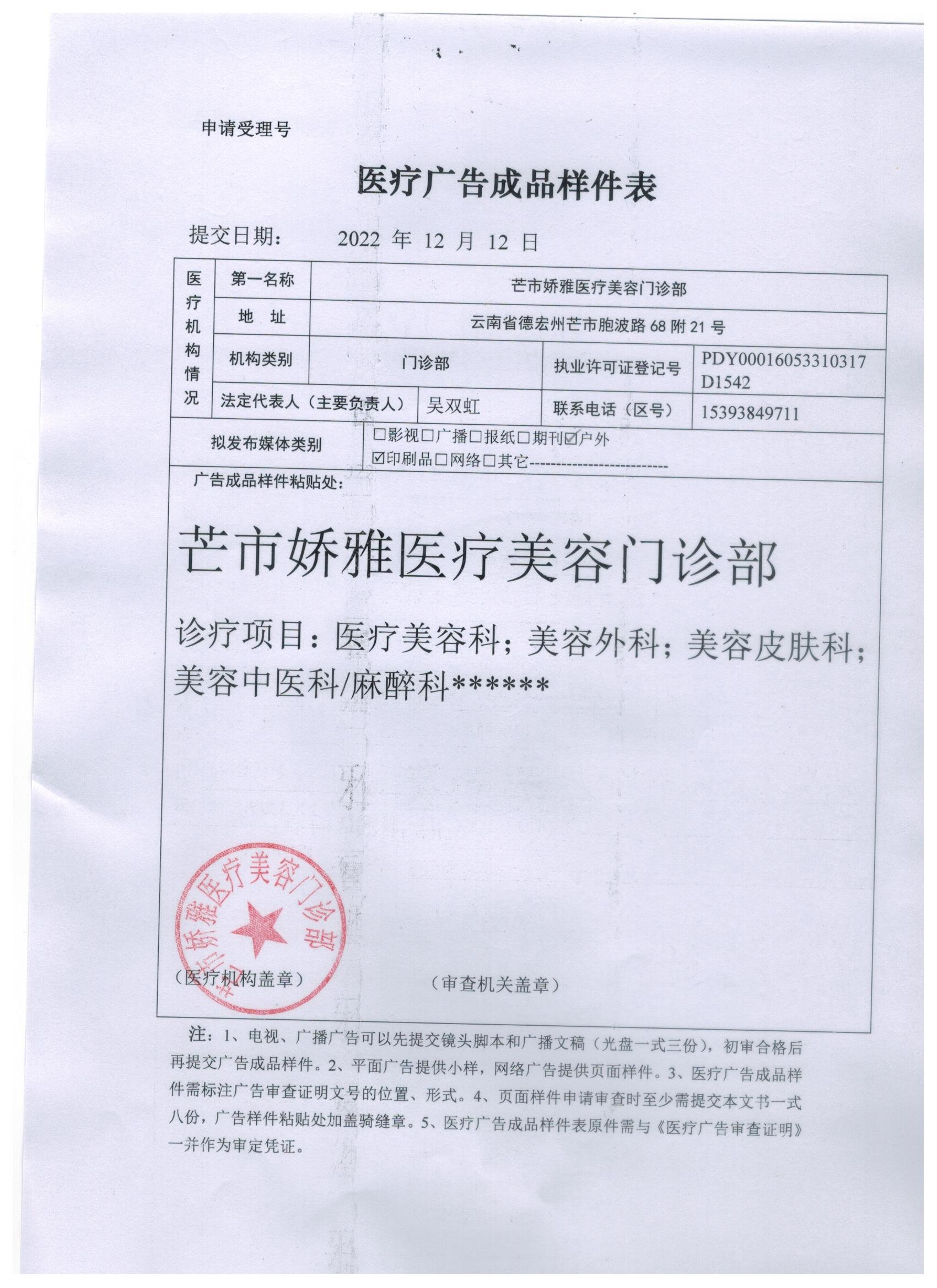 芒市娇雅医疗美容门诊部医疗广告审查证明等相关材料