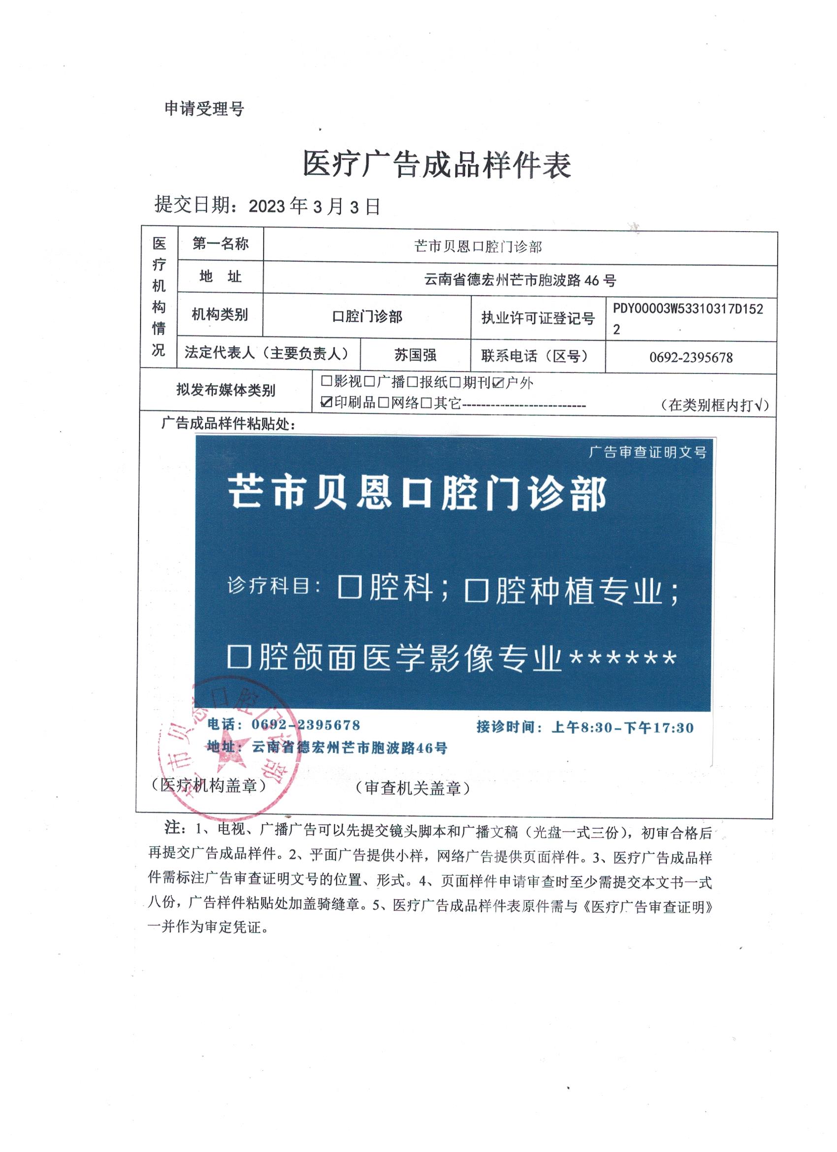 [附件: 芒市贝恩口腔门诊部医疗广告审查证明]
