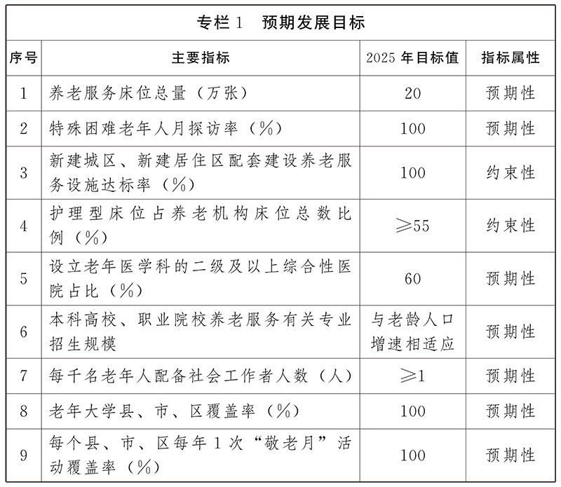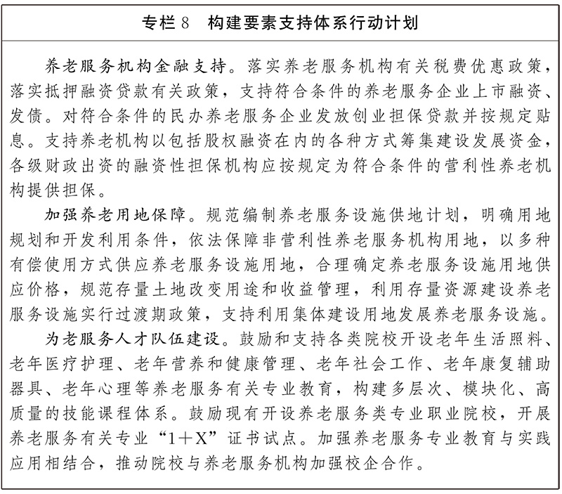 ——要素保障能力持续增强。行业营商环境持续优化,规划、土地、住房、财政、投资、融资、人才等支持政策更加有力,从业人员规模和服务能力不断提升,养老服务综合监管、长期护理保险等制度更加健全。