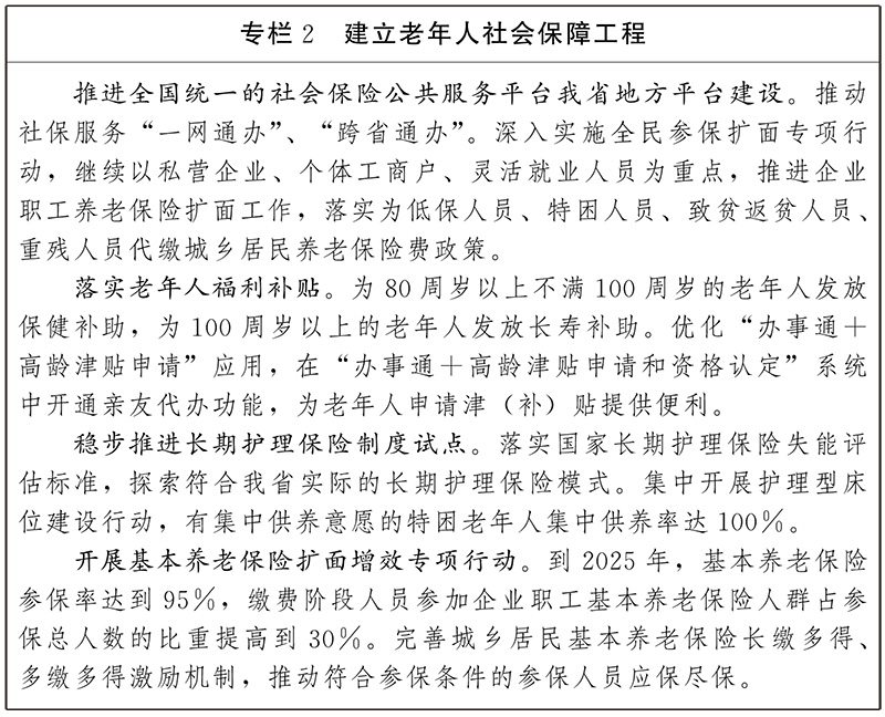 ——可持续的多层次社会保障体系更加健全。进一步提高基本养老保险参保率,推动基本养老保险法定人群全覆盖,持续推进城乡居民养老保险适龄参保人员应保尽保,逐步提高退休人员基本养老金和城乡居民基础养老金。企业年金覆盖率进一步扩展,第三支柱养老保险进一步规范发展。