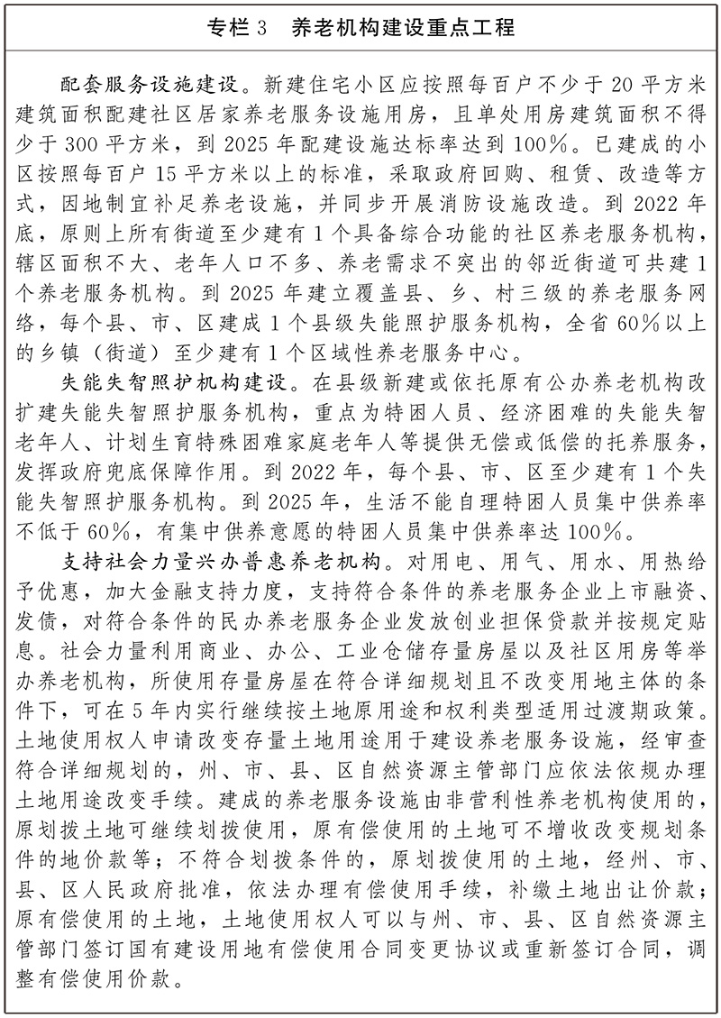完善对护理型床位的认定。进一步盘活养老床位存量、优化护理型床位增量,推动养老机构提升护理型床位设置比例和康复护理水平,增强护理型床位匹配供给。聚焦高龄及失能失智老年人长期照护服务的刚性需求,把提升养老机构护理能力摆在更加突出的位置,重点扶持发展满足基本养老服务需求、突出护理功能的养老机构。聚焦失智老年人的特殊需求,开辟失智照护楼或照护单元,鼓励社会力量兴办面向失智老年人的照护机构或开辟专区。推进失智照护、失能护理示范机构建设。优化拓展特困人员供养服务设施(敬老院)服务功能,推动具备一定条件的特困人员供养服务设施(敬老院)作为农村养老的核心阵地,将服务范围和协调职能延伸至村级居家养老服务站(点)和居家老年人,拓展其农村区域性养老服务中心、指导中心和支持中心功能。加强光荣院建设,到2025年初步建成以州市级为骨干,辐射全省、惠及全体,满足集中供养条件退役军人及“三属”的养老服务需求的光荣院体系。