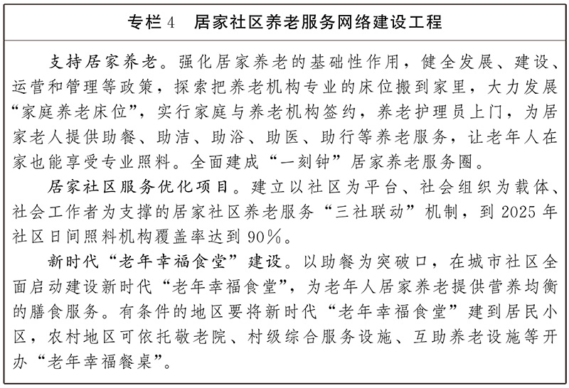 不断夯实家庭养老基础地位,支持养老服务机构将专业化服务延伸至家庭,向居家老年人及其家庭成员提供生活照料、家务料理、康复护理、培训支持、精神慰藉等服务。