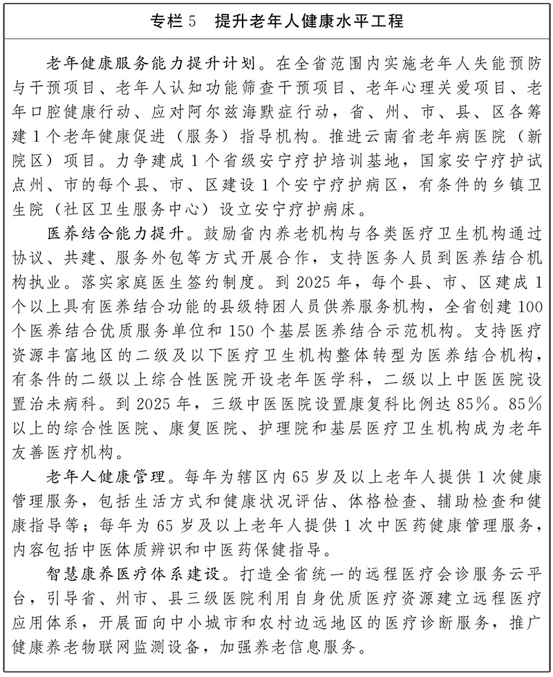 加快转变以治病为主的传统医疗卫生服务方式,把为老年人提供连续性、整合型的健康服务作为健康云南建设的重要内容,健全省、州市、县、乡四级老年健康服务网络,构建“预防、治疗、照护”三位一体的老年健康服务模式,为老年人提供全方位健康服务。认真做好老年人健康教育、预防保健、疾病诊治、康复护理、长期照护、安宁疗护等服务,延伸养老服务链条,实现从健康管理、失能失智照护到安宁疗护的老年人生命周期全覆盖。动态追踪分析研判全省老龄化状况,推进老年健康促进行动,加强老年病预防和早期干预,构建失能老年人照护体系,加强老年健康服务,强化老年人健康管理,提升老年医疗服务能力,发展社区和居家医养结合服务,完善长期护理保险、医疗保险等制度。