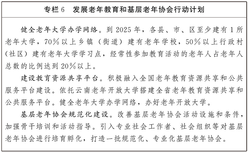 倡导终身学习理念,将老年教育纳入基本公共教育服务体系,构建衔接沟通各级各类教育、认可多种学习成果的终身学习服务体系,完善注册学习和弹性学习制度,畅通不同类型学习成果的互认和转换渠道。扩大老年教育资源供给,实施发展老年大学行动计划。鼓励有条件的高校、职业院校加强学科建设与人才培养,积极融入全国老年教育资源共享和公共服务平台建设。依托云南老年开放大学搭建全省老年教育资源共享和公共服务平台。健全老年大学办学网络,办好老年开放大学。支持部门、行业企业、高校举办的老年大学面向社会开放办学。完善覆盖省、州市、县、乡、村五级老年教育服务体系,积极推进“家门口”老年大学建设。加大老年教育经费投入,夯实基础设施建设,改善老年大学办学条件、拓宽办学规模,促进老年教育高质量发展。到2025年,各县、市、区至少建有1所老年大学,70%以上乡镇(街道)建有老年学校,50%以上行政村(社区)建有老年大学学习点,经常性参加教育活动的老年人占老年人总数的比例达到20%以上。